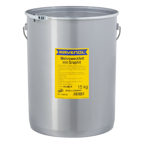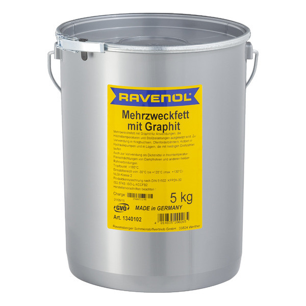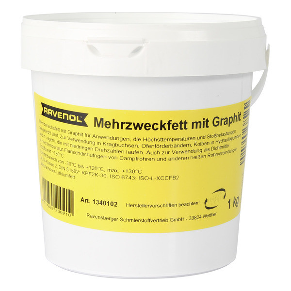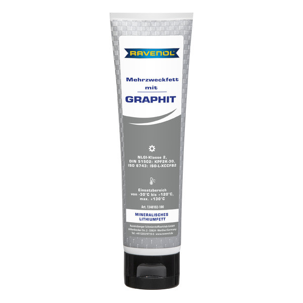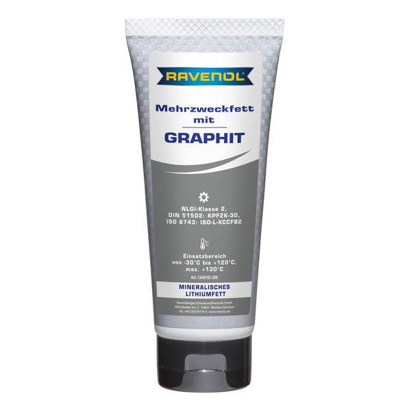 RAVENOL Mehrzweckfett mit Graphit – универсальная водостойкая пластичная смазка, изготовленная в Германии на основе минерального масла с использованием в качестве загустителя литиевого мыла. Введение графита повышает нагрузочную способность смазки при высоких температурах. Высокораффинированное базовое масло содержит менее 3% полициклических ароматических соединений.Графит при высоких температурах обеспечивает образование смазочной пленки на рабочих металлических поверхностях и позволяет достигать оптимального смазывания