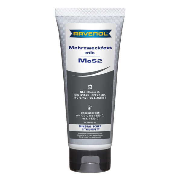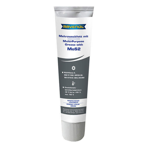 RAVENOL Mehrzweckfett mit MoS2 - автомобильная смазка на минеральной основе, загущенная литиевым мылом с добавлением антиоксидантных и антикоррозионных присадок, а также дисульфида молибдена (MoS2).